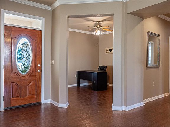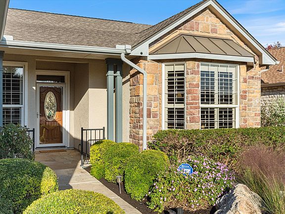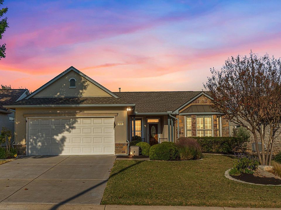 Popular Dickinson Floor Plan full of charm and function! Enter into this delightful home with 2-bedroom + study and no stairs to the front, back, or garage! You’ll also find thoughtful touches everywhere including plantation shutters, crown molding, luxury vinyl plank wood floors, retractable screen on back door, and cozy newly replaced carpet in the bedrooms. The kitchen is a cook’s delight with a handsome stone backsplash, granite countertops, rich stained cabinets, stainless steel appliances, upper and lower cabinet lighting, and those glorious pull-out shelves that save your knees and back. Enjoy your morning coffee in the sunny bay-window breakfast nook or relax at the breakfast bar. The living area is warm and inviting, complete with a gas fireplace, built-in shelves, electrical floor outlet, and plenty of space to entertain or just hang out with friends and family. The primary suite boasts another bay window (perfect for a cozy reading chair), and ceiling fan. The ensuite bath offers a stand-up shower with natural light above and a seat. Head out back to a fabulous extended flagstone patio complete with seating wall and fenced backyard that feels private making a great spot for grilling, chilling, entertaining, grandkids and pups. And–don’t miss the utility room with sink and cabinets that is adjacent to the extended garage with storage, a workbench, replaced irrigation controller, and water softener. Located near golf courses, amenity centers, Legacy Park, and The Market Place for dining, sipping, and socializing. This wonderful home checks all the boxes for comfort and convenience. Roof 2019, A/C 2022. Kitchen refrigerator, washer and dryer, and 55" smart tv in primary bedroom all convey. Kitchen table and chairs, office desk and chair, bar stools, and rug are all for sale.