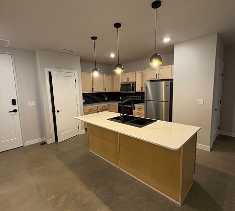 Brand new 2 bedroom home located in the heart of Downtown Sioux Falls. Walk to all the newest restaurants, coffee shops, The Levitt at Falls Park, Farmers Market and more!! Outdoor space for activities, onsite fitness studio, roof top deck with pool table, onsite coffee shop! Parking included!! 2 bedroom 2 bath, pantry in kitchen and large breakfast island. Walk in closet in primary bedroom. Ceiling fans in primary bedroom and living room. Patio with water views. Beautiful concrete floors that fits the downtown vibe! Animal friendly community! You can do a short term lease from 3 months up to 14 months.
