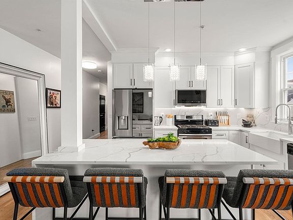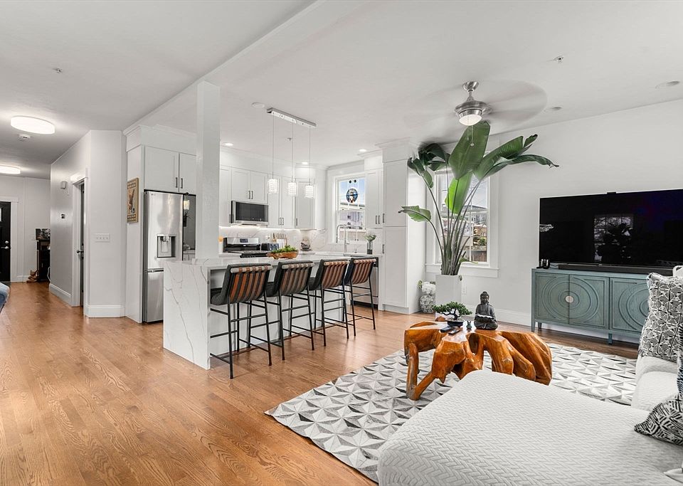Experience refined condo living with the space, feel, privacy, and comfort of a single-family home. This modern townhouse consists of approx. 1,588sf across an expansive 2 story, open concept floor plan featuring 2 spacious bedrooms, 2 full bathrooms, a finished basement with additional media room / flex space and an approx. 250sf unfinished room / storage area. Overlooking the home’s flowing main living room and dining space, the recently renovated kitchen features new custom cabinetry, beautiful quartz countertops, large island with waterfall edge and multiple brand new appliances. The front exterior is enhanced by a wrap-around porch leading to the private, direct entrance of the home and the back yard provides an additional outdoor space with a common deck and fenced yard. This home is complete with a private driveway with 2 deeded parking spaces, professional management and a convenient location, just blocks to the Andrew T Stop (Red Line) and about 2.5 miles to Downtown Boston.