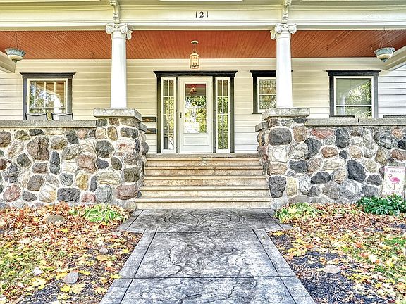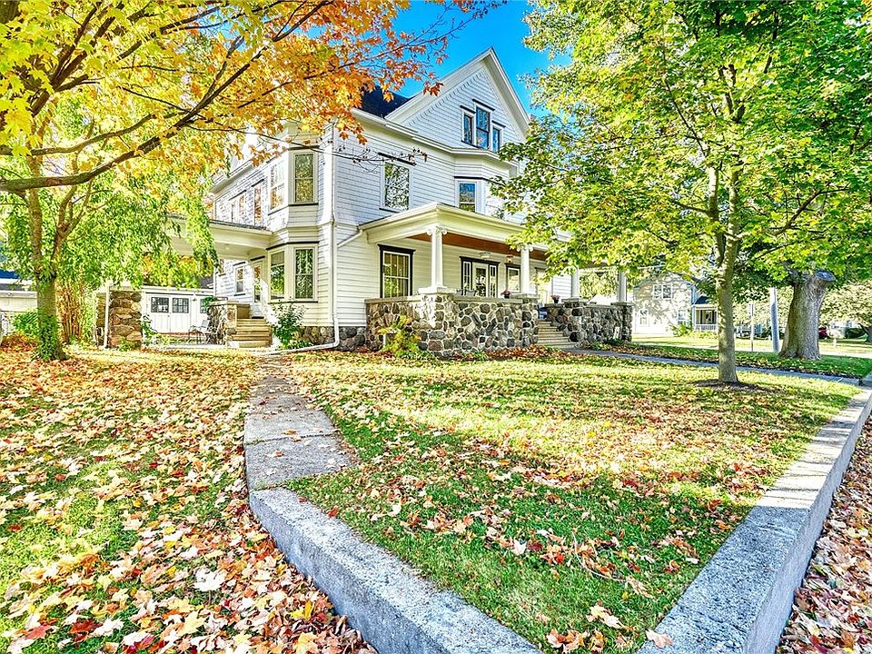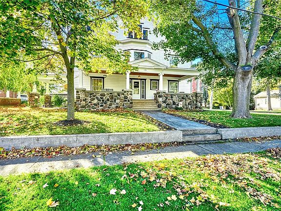 STATELY! SPACIOUS & STORIED! This WEBSTER VILLAGE HOME doesn’t go unnoticed — with a GRAND Stone Front Porch and Tall Columns, its TIMELESS PRESENCE anchors the corner of East Main and Dunning! RICH with Original Detail and 1900s CRAFTSMANSHIP! Coffered Ceilings! Leaded & Stained Glass! Moldings! Hardwood floors! Pocket Doors, Built-in shelving and Bookcases!