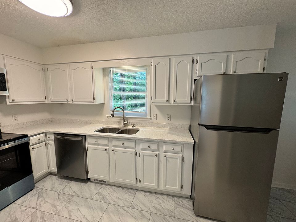 Stainless steel refrigeratorNew granite countertopsLuxury plank flooringNew white brick exterior