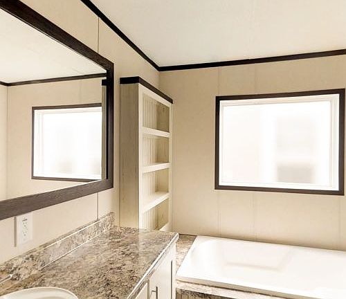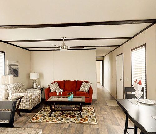 This inviting manufactured home offers a spacious open-concept design, blending the living, dining, and kitchen areas into one seamless flow. Large windows bring in natural light, highlighting the clean lines and neutral tones that give the space a warm and modern feel. The living room provides plenty of space for relaxation and gatherings, while the adjacent dining area makes everyday meals and entertaining effortless. The kitchen is both stylish and functional, featuring ample cabinetry, black appliances, and a breakfast bar with seating. High ceilings with exposed beams and ceiling fans add a touch of character and enhance the open, airy atmosphere. With durable flooring throughout the main living areas and a layout designed for comfort and convenience, this home is move-in ready and easy to maintain. Don't wait-homes with this much style and functionality don't last long. Schedule a showing today to make this beautiful home yours. Disclaimer: Photos shown are staged to highlight layout and features. Furnishings and decor are not included.