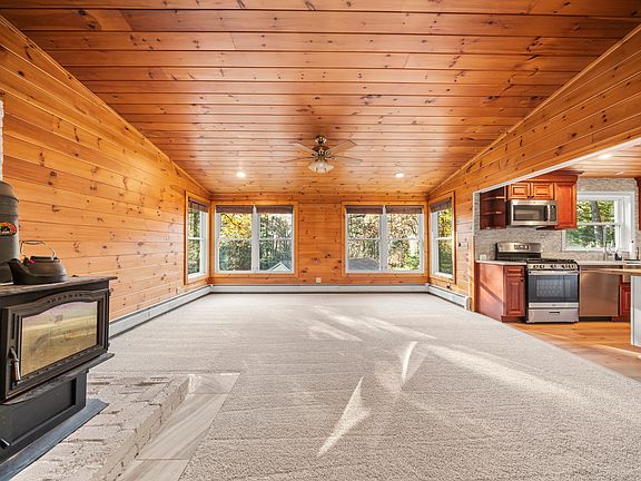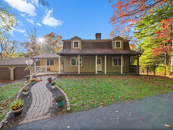 Private country retreat on 5.04 acres with a 1,200 SF outbuilding & paddock, ideal for horses or a home business. Set back from the road, this beautiful property offers open space, wooded views, and a peaceful natural setting with a babbling brook and walking path through the trees. The large covered porch is perfect for relaxing and taking in the view. Inside, the living room, kitchen, and dining area share an open layout filled with natural light from oversized windows. The updated kitchen features a gas stove, generous cabinetry, and warm wood details that create an inviting atmosphere. The first floor primary suite includes a full bath and walk in closet, providing comfort and convenience for main level living. Upstairs are 3 comfortable bedrooms and a full bath. The walk out basement provides expansion possibilities and leads to a covered patio area with a private hot tub, perfect for relaxing while overlooking the peaceful surroundings. The impressive 1,200 SF two story outbuilding features radiant in floor heat, electricity, and a half bath, offering flexibility for a studio, workshop, or approved in-home business. This property is designed for a relaxed country lifestyle with areas for gardening and recreation, a paddock area suitable for horses or other animals, and thoughtful touches that enhance the country charm, including a chicken coop, dog kennel, and playscape nestled among the trees. The maple taps complete the classic New England character of this home.