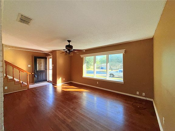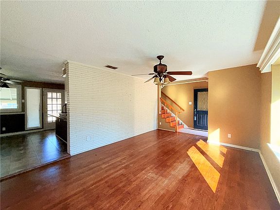 This spacious home on a corner lot in the East Cliff Subdivision makes an impressive entrance with a large living area featuring a decorative white brick wall, hardwood floors, and plenty of natural light. At the heart of the home is a generously sized kitchen, perfect for cooking and gathering with loved ones. It offers ample white cabinets for storage, Formica countertops, and black appliances, including a smooth electric stovetop, microwave, wall oven, and dishwasher. The split floor plan provides privacy for the owner's suite upstairs, while additional bedrooms are located downstairs. There's also an extra room off the kitchen that can serve as a fourth bedroom for guests or a second living area. The backyard is fully fenced with a covered patio, and the rear garage accommodates two vehicles along with a workshop or storage area and a basin. Mature trees throughout the property provide extra shade.