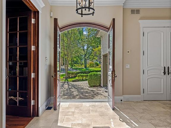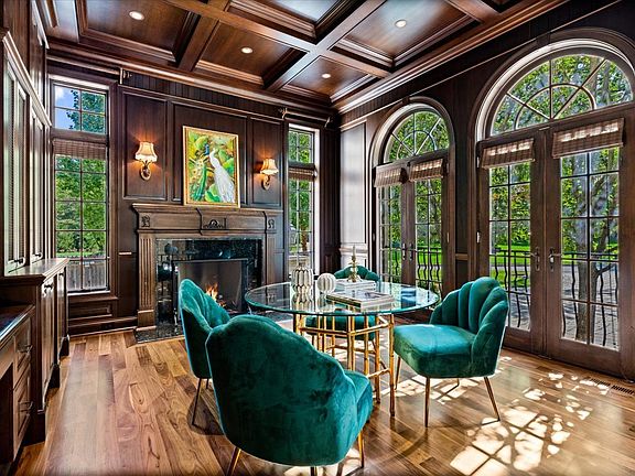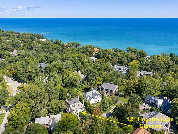 On a storybook lane in East Glencoe--just moments to the lake and an easy walk to town and train--this Heritage Luxury-built residence marries a stone facade, slate roof and copper detailing with luminous, livable spaces. Sun pours through oversized windows, spotlighting masterful craftsmanship. With nearly eleven-foot ceilings on the main level and over twelve feet upstairs, the architecture breathes while natural light takes center stage. Exquisite details abound: extensive millwork, arched passages and gentle curves, with French doors and tailored fireplaces gracing both public and private rooms, setting a quietly grand tone. From the cherry-paneled library to the marble-clad primary bath to the in-home movie theater, everyday life here delights the senses and elevates livability. Inside, daily routines find their center in a sunny kitchen and fireside family room framed by a graceful curved wall of French windows-light slips across gleaming hardwood floors and the whole space feels calm and airy. When the guest list grows, the coffered living room opens seamlessly to expand the heart of the home; when it's just you, it contracts to cozy perfection. A cherry-paneled library with fireplace and twin French doors offers a richly tailored place to work or read, while arched, millwork-wrapped passages lead to the formal dining room. Between kitchen and dining, a butler's pantry/wet bar with sink and beverage center keeps service seamless. Upstairs, four ensuite bedrooms include a serene, hotel-caliber primary retreat with limestone fireplace, marble steam shower, soaking tub and dual fitted walk-in closets. Laundry on this level keeps routines simple. The lower level is a true destination: a movie theater for Friday nights; a temperature-friendly wine cellar; a handsome wet bar overlooking a second fireside family room; a large recreation zone and a fitness room tucked into a curved bay-plus two additional bedrooms and a full bath for guests or an au pair. Outside, bluestone terraces frame green views and easy flow to the lawn. Served by the award-winning Glencoe District 35 schools and New Trier High School (District 203), the location pairs village convenience with academic excellence. A rare four-car garage-two attached and two detached-handles everyday life and weekend toys. With its East-of-Sheridan address, architectural integrity and turnkey condition, 121 Hogarth captures the quintessential North Shore lifestyle: fresh lake air, village walkability and impeccable craftsmanship in one timeless home.
