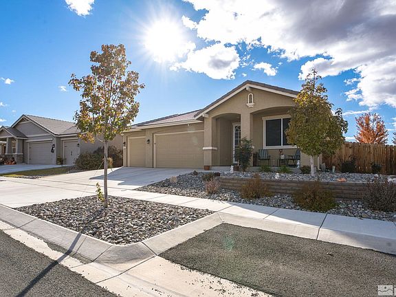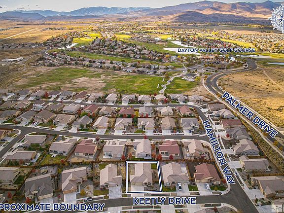 Golf Course Home Foooore Sale at Legado!!! Play par-72 on 18 holes at the acclaimed Arnold Palmer designed Dayton Valley Golf Course and then afterwards meet for the 19th hole at this beautiful Legado home. Crafted in 2016 by Silverado Homes, this 1732 square foot “club” house offers 3 bedrooms, 2 bathrooms, 1 bonus room, and a 3-car garage on 0.20 acres with mountain views. Tee off against other buyers and submit an offer now to make this home your hole in one. If you miss out, you will not get a mulligan., The front yard is adorned in river rock making maintenance of the minimal plants of the xeriscape as easy as programming the automatic drip irrigation. Bask in the warming morning sun from the eastwardly covered porch while enjoying a hot cup of mountain views. The tall entry door receives added protection by a security door that allows access to the entry of an open floor plan illuminated by a high ceiling chandelier. The entryway is paved in hardwood paths leading past a bonus room, laundry room, coat closet, and garage enroute to the great room combining the kitchen, dining room, and family room. Keep conversation with company while cooking in the kitchen. Quartz countertops tie in the warm color palette of rich brown cabinetry and light cream walls with black appliances including a gas range/oven, microwave, dishwasher, and even double-bowl sink. Place in and pick from the pantry. Please the palate at the island underneath ambient pendant lighting or serve at the dining table. Gather around a round table and share the day while passing dishes to fill plates in the dining room. Recessed lighting will keep the room lit for continued conversations long after the outside light has dimmed from dusk to dark. Use the family room also as a friend room or a you room and stream favorite shows underneath the air stream from the ceiling fan or open the patio door to let the outdoor climate climb in. The hallway leads the way to all sleeping quarters. A smart thermostat allows the temperature to be kept ambient from bed made with linen from the closet. The master suite is sweet. Air drafts from the ceiling fan, as delicately as butterflies’ fluttering wings. Ready for bed in the ensuite at the dual vanity sink after the calming waters of the bathtub or shower stall, as if a caterpillar entering metamorphosis. Emerge from the large walk-in closet ready for the day, as if a butterfly from cocoon. Two bedrooms and a shared bathroom accommodate guests. Similar in size, both bedchambers boast ceiling fans, but one features a walk-in closet while the other a reach-in closet. Guests can cleanse in the tub/shower combo and freshen at the single vanity sink in the communal bathroom before commuting home. A bonus room shut behind French doors provides flex and can open to anything from office to den, home gym to game room, or even a craft room with a sewing desk built into the built-in cabinets. Separate colors from whites in a dedicated laundry room that separates dirty clothes from the clean house. The 3-car garage can park a mix and match of cars, trucks, quads, side-by-sides, motorcycles, and dirt bikes. The many cabinets can store a match and mix of many things out of sight. Tinker on toys with tools at the work bench. Also garaged are the water softener and water heater. An oasis retreat in the high desert, the back yard’s covered patio provides shade from the westwardly setting sun and shelter from the falling rain. Butterflies drink dew droplets from blades of the grass lawn and dot the sky as they flutter from rose to rose in the garden. Especially if golf is your game, but even if golf is not your game, this contemporary style house located in the Dayton Valley Golf Course community of Legado is game for you. Dayton Valley Golf and Country Club is recognized as one of the premier golf courses in Northern Nevada that even hosts the longest standing PGA Tour Qualifying tournament in the country. The spectacular high-des