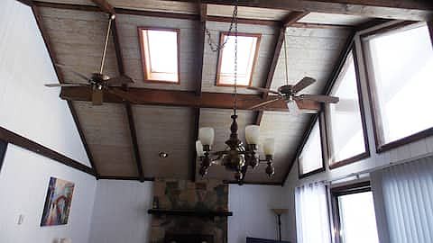 Open-concept living/dining area with large windows and cathedral ceiling