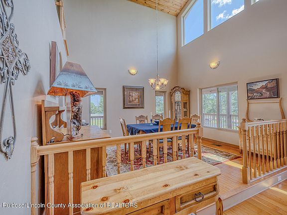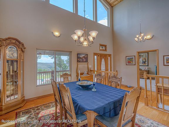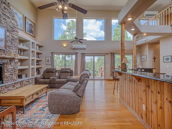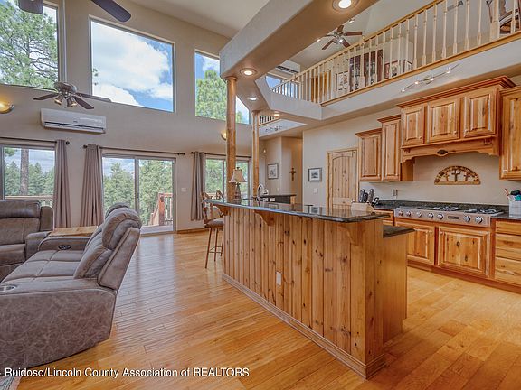 This beautiful 3100+ sq ft home on 2 acres sits atop of Camelot Mountain on the southern edge of Ruidoso with views of the mountains. The open concept design with three full spacious bedrooms, an office/bedroom and a large loft with a full bath. The bedrooms and loft are carpeted and hardwood floors are in the common areas and hallways. Both the primary bedrooms and the living area have gas fireplaces set in natural stone, each with its own remote starter. The large kitchen includes stainless steel appliances, granite countertops, a gas stove with a grill, a large walk-in pantry and plentiful high end hickory cabinetry. The two Trex decks offer great space to entertain. For added enjoyment of this spacious property is a small viewing deck down the gentle slope... Sit on Adirondak chairs to enjoy reading, savor your evening wine or observe the animals roaming in the canyon area below. In addition, this home has a large natural gas Generac generator, central AC, natural gas heat, and a two-unit mini split HVAC system that provides year-round comfort for the four seasons. This home is move-in ready. The primary bedroom furniture, living room furniture and assorted other furniture pieces are included.