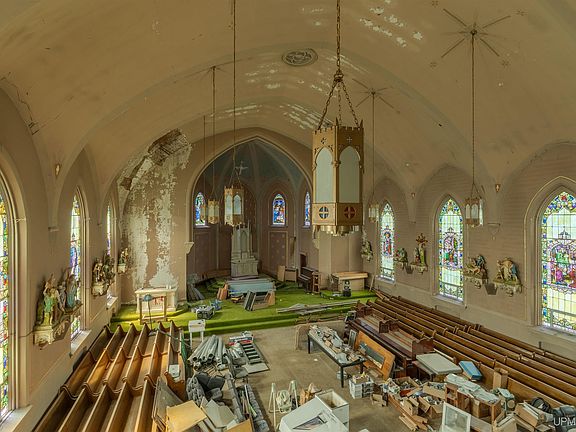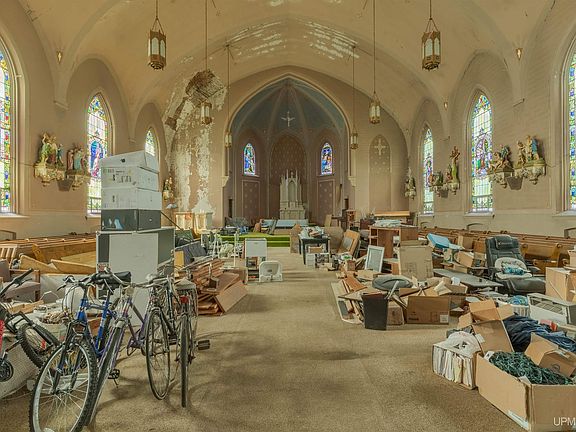 Looking for a unique building? This historical former church offers so much charm and character, with six floors and 18,000 square feet! A large entryway leads into the large gathering room with expansive vaulted ceilings and ten stunning stained glass windows. An adjacent stairway leads to the choir loft with access to the bell tower with a majestic 600 lb. bell that dates to 1912. There are several side rooms off of the meeting area along with a hallway going to the fully renovated basement, which offers an open concept floorplan and turn key living! This level is smart-enabled including thermostat, lighting, doorbell, water shutoff, locks, integrated audio wiring, and LED lighting. It includes a nice office area, living room, lounge, commercial kitchen, several storage rooms, spa bathroom, and bedroom. All situated on a .74 acre lot with lots of privacy. With this one, the possibilities are endless!