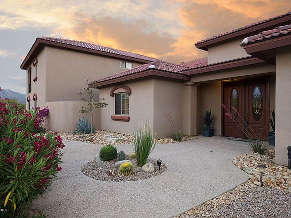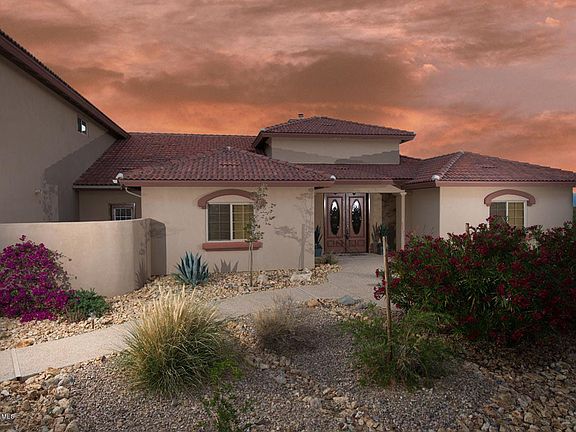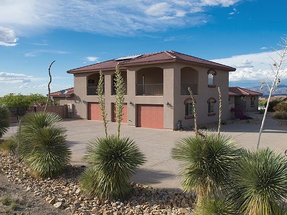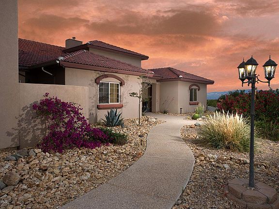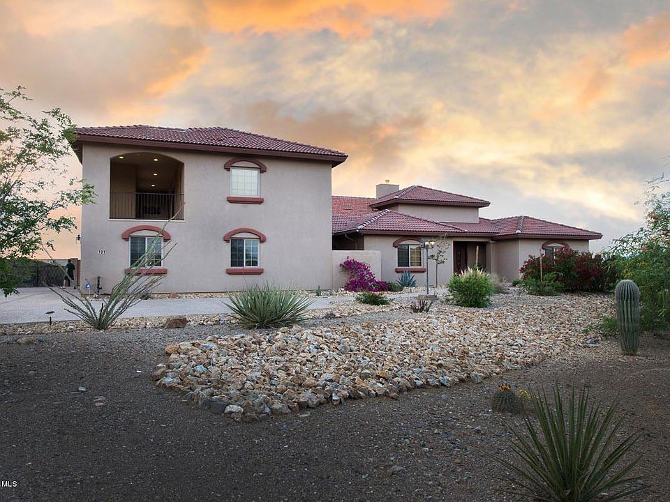 Located on a quiet cul-de-sac, this gorgeous home rests on a lush 1+ acre lot. Enjoy 360 degree mountain views. Stunning Arizona sunsets from the extended back patio or follow the flagstone steps down to the fire pit. Inside is sheer luxury, from the columned entry way to the stone fireplace that extends from floor to vaulted ceiling. Recirculating air fireplace can heat the whole home & is energy efficient. Kitchen is deluxe w/cherry cabinets, granite counter-tops, & GE Profile appliances. 20x20 tile throughout w/carpet in bedrooms. Home has TWO master suites. Downstairs master has granite counter-tops & tile shower enclosure separate from Jacuzzi tub. Upstairs master suite is 818 sq ft w/extended private balcony. Both have huge walk-in closets. Large bedrooms, upgraded details everywhere. Oversized 1200sqft garage. Real, green grass yard. Grey water alternative septic system. Easy access and drive from I-10 & 83. RV's and horses allowed.