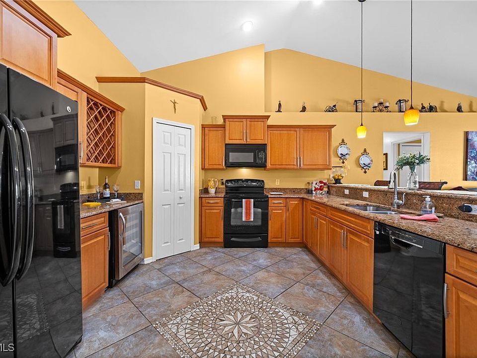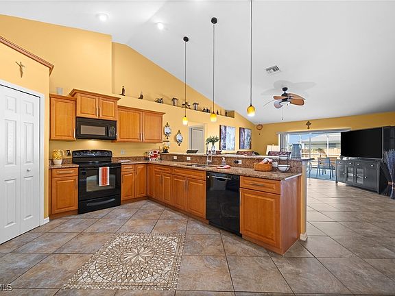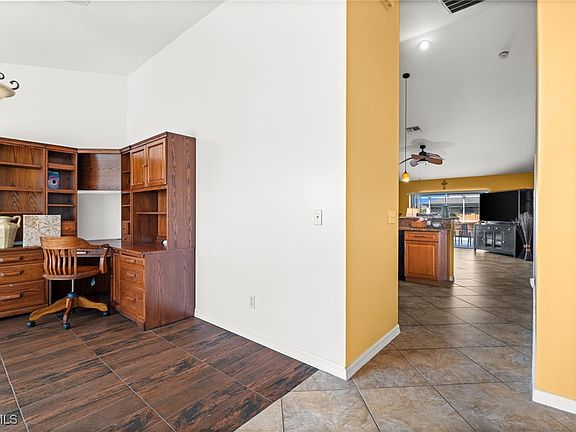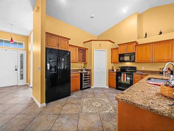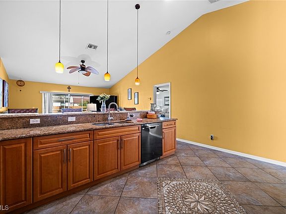This bright and cheerful, 3-bedroom den pool home has great curb appeal, a new roof (2024), and is not in a flood zone! Upon approach, the home says “welcome”! The upgraded kitchen in this 1,800 +/- SF gem is perfectly positioned steps from the dining room and the living area. It boasts granite counters, quality wood cabinetry topped with decorative molding, double sinks, sleek black appliances including a double-door refrigerator with an icemaker, a wine refrigerator, and a built-in wine rack. There is additional counter space perfect for your personal coffee bar or an array of handy kitchen appliances. A raised counter easily accommodates bar-style seating for four. A large pantry? Of course. Your dining room offers LVT flooring, and windows facing south, allowing the Florida sunshine to shine in. The living area is quite spacious and easily accommodates larger furniture or even sectional furniture and a big screen TV. The living-area-to-kitchen-flow is perfect for entertaining or a comfortable, relaxing evening at home. You will enjoy and appreciate the quality, decorative tile-on-the-diagonal throughout the main living areas. No carpet here. The spacious great room design offers excellent flow and showcases lovely views of the sparkling pool, the extended lanai, and the fully fenced (wood) backyard oasis with mature low maintenance landscaping. This tropical retreat provides privacy, a shaded space for outdoor dining, and areas for sunbathing. The den, with French doors and LVT flooring, is ideal for a quiet home office, a craft room, or a cozy reading area. The split floor plan ensures privacy with an oversized primary suite, large enough for a king bedroom suite and a sitting area. The sleek, modern, primary bath will impress even the savvy buyer with extensive, decorative wall tile, dual vessel sinks, contemporary countertops, a very, private - private water closet, and a luxurious walk-in shower with multiple shower heads. The additional two guest rooms also offer LVT flooring and share the tub/shower combo guest bath. Your indoor laundry room has newer appliances, shelving, and room for cabinetry. This priced to sell Cape Coral pool home has it all!
