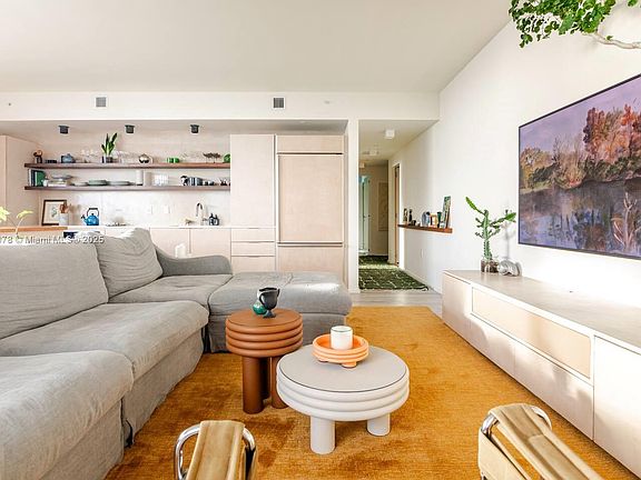 Sleek microcementBurlwood-topped islandFloor-to-ceiling windowsUnobstructed biscayne bay viewsWater viewsCustom cabinetrySpa-inspired bath