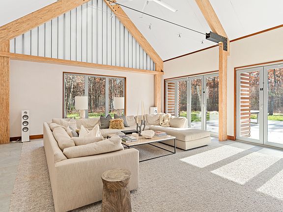 Nestled down a long private driveway in the heart of Sagaponack, 121 Northwest Path offers the ultimate Hamptons retreat, just moments from Bridgehampton and Sag Harbor Village amenities and pristine ocean and bay beaches. Designed for privacy and leisure, the estate welcomes you with a long, tree-lined approach, ample parking, and a three-car garage. A stone pathway leads to the striking light-filled entry, while the expansive bluestone patio and resort-style Gunite pool and spa invite seamless indoor-outdoor living. Entertain effortlessly on the covered porch with a full outdoor kitchen, or gather with friends around the fire pit on the lower deck as the sun sets over the surrounding landscape. Inside, architectural elegance meets coastal warmth. The first level is bathed in natural light, featuring walls of glass, a sculptural staircase, and soaring double-height ceilings. The chef's kitchen is a masterpiece, boasting a large center island with bar seating, dual sinks, Sub-Zero and Wolf appliances, a wine fridge, and an ice maker. A pass-through gas fireplace connects the formal dining area to the living room, where French doors open to the patio and pool. The primary suite offers a private sanctuary with a gas fireplace, dual walk-in closets, a luxurious spa bath, and direct access to the grounds and a private balcony. A guest suite, elegant powder room, and a laundry room add thoughtful convenience. Upstairs, a lofted office and recreation space overlook the main level and open to an expansive balcony, while three guest suites-including a junior primary with private balcony and walk-in closet-ensure comfort for all. The finished lower level continues the theme of relaxed sophistication, offering a spacious recreation room, theater, full bath, and an additional guest suite with private access to the lower deck and fire pit area. Combining bold architecture, refined finishes, and proximity to the best of Sagaponack, this property delivers timeless Hamptons luxury just minutes from beaches, boutiques, and award-winning dining.