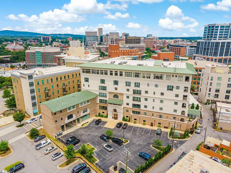 This exquisite 3bd/3ba condo exudes luxury with unique finishes and step out the door convenience to the best of downtown Greenville. With over 3000 sq ft of living space, this home features 10.5’ ceilings, beautiful handscraped dark hardwood floors, all bedrooms with en-suite baths and California walk-in closets. Open concept kitchen, living area with gas fireplace, and dining area with french doors flow together and create smooth transition to outdoor balconies for extended entertaining. Kitchen features cabinet front refrigerator, giant pantry, large island with wine fridge, and high end appliances. Spacious all-purpose flex room with tray ceiling could be used for theatre room, game or study area. Amazing laundry room with wash sink and storage. Owner's suite features french doors to a balcony, large walk-in shower with multiple heads, elongated floor tiles and free standing tub, and walk-in master closet. Two premier parking spaces in gated garage. From the stately entry and gated parking to the magnificent panoramic views of Fluor Field, Falls Park, and the Peace Center, this spacious residence with crisp design is the epitome of extraordinary living.