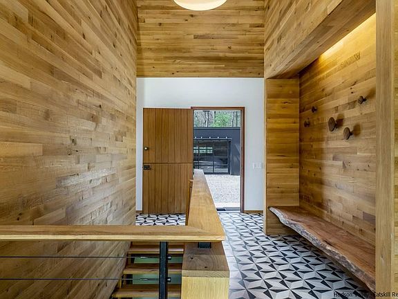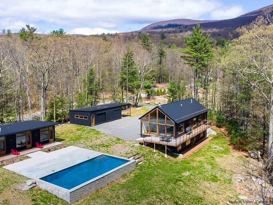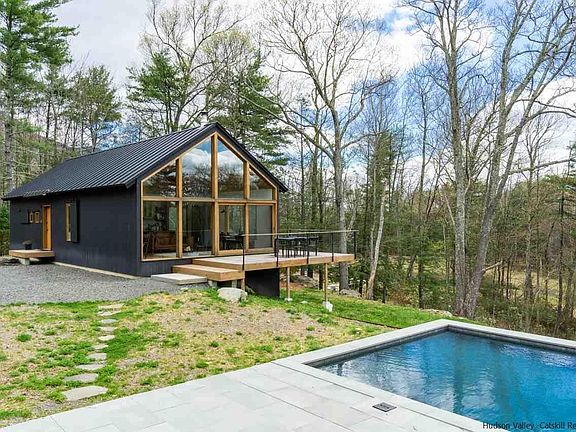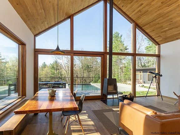 Enjoy smart living in this handcrafted architect-designed three-bedroom wood and glass modern cabin and two-bedroom guesthouse in sold-out Hudson Woods. Sited on 12.1 lush acres with heated gunite pool, oversize two-car garage and carport, every need and want have been anticipated. Walls of glass bring the outside in, and visually expand the comfortable interior. Extensive use of white oak on floors, walls, ceilings and cabinetry offers a rustic counterpoint to the modern aesthetic. The open kitchen is outfitted with Smeg appliances, concrete countertops and a blackened steel and walnut island with soapstone top. Bedrooms are spacious and bathrooms are spa-chic. A Wittus wood stove in the living room augments the radiant floor heating, and central air keeps things cool in warmer months. Cedar decking wraps around two sides of the home and is accessed by tall sliders from the living/dining space, allowing for delightful warm-weather entertaining, and from there it's just down the gentle slope to the pool and patio area. There are handcrafted finishes throughout, including custom door and window hardware and luxe lighting fixtures. Nest system controls multi-zone heating and cooling. The lower-level great room and bedrooms open to another deck that runs the length of the house. The two ensuite bedrooms in the guesthouse flank the 18x21 living area and each space has its own door to the outside. The 19x35 insulted garage is heated and cooled with a mini-split system and has a Liftmaster glass door behind the wood barn doors, making this a building adaptable to many uses. Nearby points of interest include Mohonk Preserve, Minnewaska State Park, Westwind Orchard, Arrowwood Farms & Brewery and Kingston Arts District.
