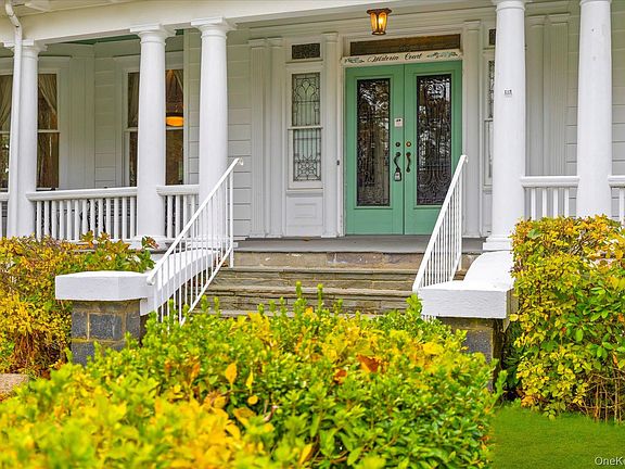 Step into the timeless grandeur of Wisteria Court, one of South Jamesport's most admired historic estates. Wisteria Court stands proudly as an iconic 1913 Queen Anne Colonial set on a .75-acre double corner property in the heart of South Jamesport, just two blocks from the beautiful Great Peconic Bay. This grand residence offers rare legal two-family status and expansive living space, surrounded by lush, mature landscaping and an extraordinary wraparound porch with over 950 square feet of covered outdoor living. Built off a storied local love story, the home carries both historic charm and remarkable scale, with approximately 4,500 square feet of legal living area, including additional space of a full basement and expansive walk up attic, nearly doubling the square footage, all with low taxes. Inside, the home features period details, tall ceilings, and multiple formal and informal gathering rooms filled with natural light. Dual dining areas include a gracious formal dining room ideal for hosting and an additional dining space off the galley kitchen suited for everyday meals. The upper levels offer an array of spacious guest bedrooms with warm wood floors, original trims, and the inviting character of early-century design. Guest bathrooms have been tastefully updated with classic finishes while honoring the home’s vintage aesthetic. Significant recent upgrades elevate the home’s functionality and longevity, including new electric service with dual meters and an upgrade to 350 amps, a new alarm system with perimeter video cameras, and extensive renovations to the rear apartment including new floors, ceilings, paint, and furnishings. Additional updates include a new oil tank, new living room floors and paint, a new HVAC system for heating and cooling, all new major appliances—stoves, dishwashers, washing machines, dryers, refrigerators, and microwaves—as well as a new home theater television and sound system. Exterior enhancements include new front walkway pavers, new lawn installation, a new gravel driveway, and new Belgian block driveway borders. All of these improvements have been completed since May 2024. The property also includes a new septic tank installed in 2019 and a new water heater added in 2020. Designed for effortless entertaining, the property provides dining for 22, sleeping for 14+ guests, and parking for up to 15 cars.