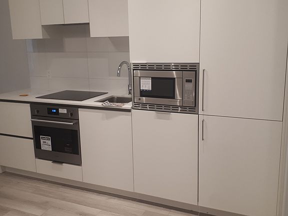 Laminate flooringSleek kitchenBuilt-in appliancesStylish backsplashContemporary finishes