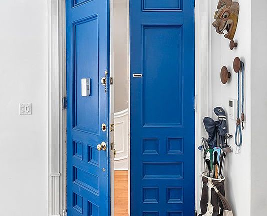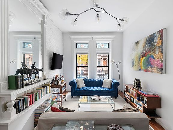 Set within one of Harlem’s most celebrated landmark districts, the home sits on a picturesque, architecturally significant brownstone block. Enter through stately oversized double doors into a living room where tall south-facing windows with original stained glass bathe the space in warm, colorful light. Exposed brick, ornate original window and door frames, a decorative fireplace, and hardwood floors create a rich prewar ambiance rarely found today.