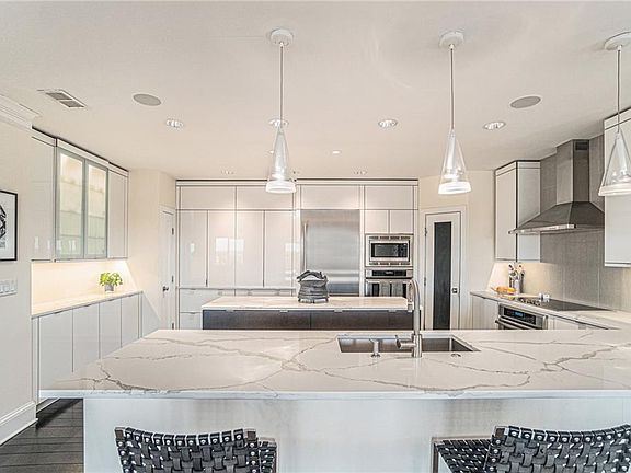 The gourmet kitchen, remodeled by Portfolio Kitchen and Home, offers ample counter space and cabinetry, including a pantry. The center island and breakfast bar/island are perfect for casual dining and entertaining. The high-gloss cabinetry finish adds a sleek, sophisticated touch. Stainless steel appliances, an electric range and hood, double ovens, and a microwave complete this true Chef's kitchen.