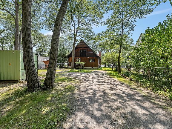 Situated on a point with a south-facing waterfront, 1210 Bayview Drive has views of the river and spectacular sunsets. Set safely outside the floodplain, the property is treed with mature oaks and maples. Built in the early seventies, this home features original wood accents and unique architectural details, with an open-concept main living area and two flexible rooms that are perfect for a home office or library. The main floor also features a den/family or bedroom, a full bathroom, and a laundry room. The circular staircase leads to the second floor, where the primary bedroom retreat features a skylight for stargazing, a private three-piece en-suite, and access to a balcony with river views. Two additional bedrooms also open onto a balcony at the front of the home, and they share a 2-piece bath. Entertain or unwind on the covered back deck, where the ebb and flow of river life provides the perfect backdrop. The unfinished basement, accessible via exterior cellar doors, offers additional storage and or a workshop. Outdoors, a movable storage container has storage space for garden tools and recreational toys. This property has tremendous potential, whether you use it as your cottage or principal residence, you can enjoy year-round waterfront living. With Kanata only 25 minutes away, you have the ideal blend of natural tranquillity and city convenience.