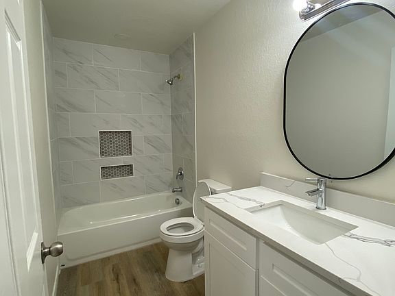 This beautiful home offers luxury vinyl plank flooring throughout the home, white shaker cabinets, quartz countertops, recess lighting, new light fixtures, and ceiling fans in every room. Huge master bedroom with walk in closet. The bathrooms include new vanities, framed mirrors, new toilets, and Carrara matte tile for tub/shower. Big backyard with long driveway for 3+ cars.