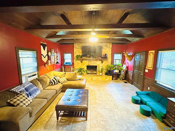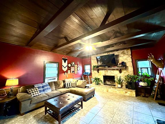 Rock fireplaceNew water heaterNew countertopsBuilt-in bookcasesUpdated appliancesRustic open beamsLots of storage
