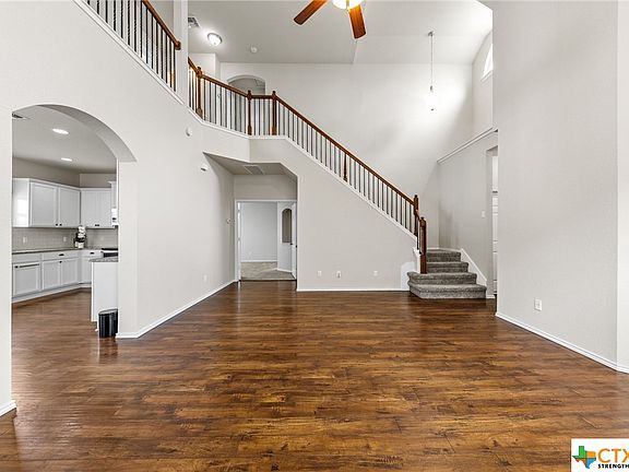This gorgeous white stone exterior home awaits you! Step into this two story living room with soaring ceilings, wood flooring, and so much natural light! Open to the Kitchen/Breakfast area which boasts, granite counters, tile backsplash and stainless appliances. Refrigerator does convey! Primary Bedroom is Downstairs with his/hers sinks, granite counters, separate shower, garden tub and spacious walk-in closet. The iron railing up the stairway sets this one apart from others! The recent carpet (04/22) throughout the spacious bedrooms and game room, and the recently completed interior paint makes this home feel brand new again! The Air conditioning unit was replaced and upgraded 7/14/22. Don't miss the covered patio in back overlooking the back yard! Lots of extras: ceiling fans, sprinkler system, and more! Neighborhood pool, Belton ISD Schools! Don't miss this one! Buyer to verify square footage.