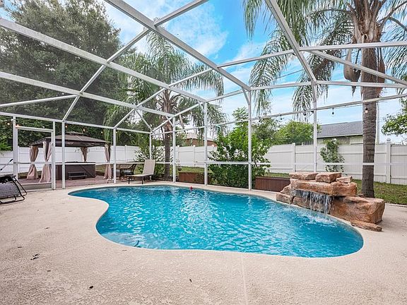 Newer pool screen enclosureFully fenced yardPool homeNew light fixturesNew gateVinyl privacy fenceCompletely refreshed pool experience