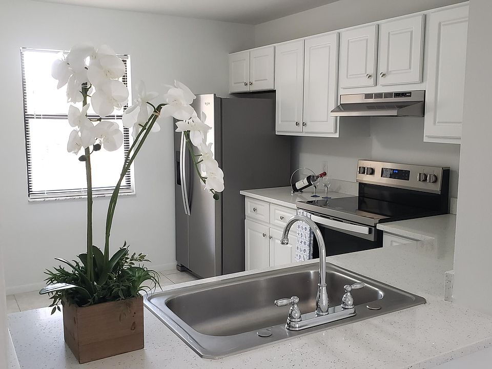 Newly painted, spacious corner unit 2/2 condo with water views from all rooms. Excellent location in the heart of Royal Palm Beach. New flooring. New Whirlpool stainless steel appliances. New quartz countertops. Updated eat-in kitchen with new raised panel cabinet doors. Renovated bathroom. Split bedrooms, master bedroom has own balcony access door. Large walk-in closet. Vaulted ceiling. Laundry inside unit. Lots of natural light. Enclosed Balcony with storage room. 2 community pools. No waiting period to rent. All ages welcome. Pet-friendly community. TV cable, roof and exterior building maintenance included. Lots of guest parking. Close to Village of RPB, parks, library, shopping centers, medical, public golf course, schools, and much more! Minutes from the beach and Florida highways.