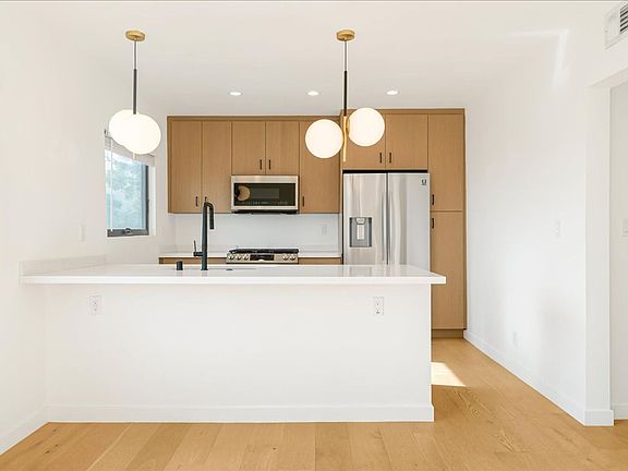 Inside, a sprawling open floor plan creates the perfect backdrop for entertaining, relaxing, and everyday comfort. The sunlit living room opens to a private, south-facing balcony where sweeping city views become part of your daily routine. A chef-inspired kitchen anchors the space with warm tan hardwood cabinetry, quartz countertops with bar seating, sleek stainless steel appliances, and contemporary lighting.