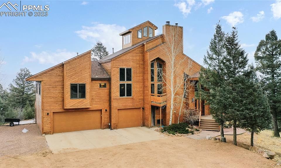 Spectacular mountain home on acreage, minutes from town, with breathtaking Pikes Peak Views! From the moment you walk through the front door and enter the Great Room, be prepared to be amazed. Vaulted ceilings, wood burning fireplace, hardwood floors, spiral staircase that leads up to the observatory to sit and enjoy the 360 degree views. Updated Gourmet chefs kitchen includes large center island with counter-bar, granite countertops, Wolf cooktop 6 burner stove, double wall ovens, trash compactor, and side by side refrigerator. Massive deck with areas to sit no matter what time of day, covered area for the warm summer afternoons, open area to relax and take in the sun and stunning Pikes Peak Views or enjoy sitting in the hot tub under the stars. The primary suite is located on it’s very own level with a sitting area, attached 5 piece bathroom, walk in closet and a private deck. Both of the other bedrooms on the upper level are spacious and each have their own attached private bathrooms. Beautiful home office with floor to ceiling windows to let in the natural sunlight. Walk out lower level with a family room, bedroom/office another full bathroom and a small craft room/storage. 3 car attached garage, RV parking with a 30 amp electric hookup and a large invisible dog run area around the land. The stunning home sits on 7.4 acres of treed, rolling property that makes you feel completely secluded. Mountain living at its finest!