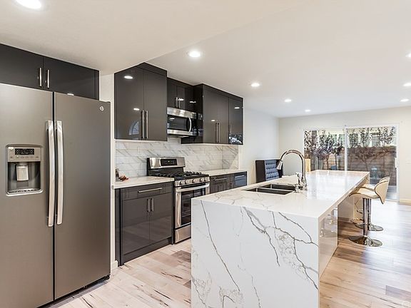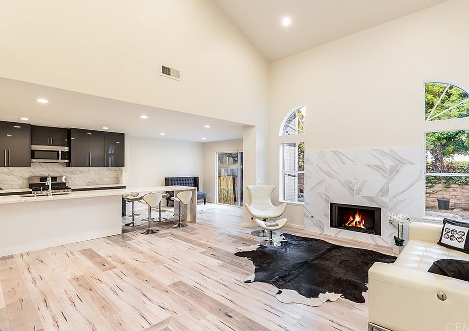 ONE OF A KIND, COMPLETELY REMODELED TOWNHOME W/TRUE OPEN CONCEPT FLOOR PLAN. Entry opens to brand new 8" plank high-end laminate flooring & to soaring vaulted ceilings with recessed lighting. The entry way steps down into the spacious family room offering a custom tiled fireplace, tall arched windows & open to the designer kitchen. The kitchen features custom Italian cabinetry, marble countertops, full subway tiled backsplash, stainless steel appliances, an island with marble waterfall countertop, two-sided bar top seating, recessed lighting & a breakfast nook with a sliding door opening to the back patio. Upstairs, there is a a master bedroom with vaulted ceilings, recessed lighting, a wall of mirrored closets & an ensuite master bathroom. Remodeled master bathroom also offers custom Italian cabinets, marble countertops & backsplash, a bowl sink & a custom tiled shower with a glass enclosure. Two additional bedrooms both offer vaulted ceilings, recessed lighting & new carpeting. The upstairs hall bathroom matches the master bathroom in design & finishes. An attached, finished garage is accessible at the kitchen area through double-doors & offers a laundry center with storage shelves. The backyard offers a concrete deck, a rear block wall, a perimeter of planters & offers a view of mature trees around the home. There is a community swimming pool & spa, greenbelts & a gated RV parking area for owner's use.