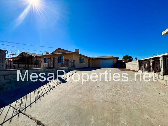 This two-bedroom, one-bathroom home is situated in Barstow, conveniently located just a minute from the 15th and 40th freeways. From the street, you will be greeted by a spacious concrete driveway and low-maintenance front landscaping. The interior features plank flooring and tile throughout, simplifying daily upkeep. The kitchen stands out with its soft close drawers and cabinet doors, adding a contemporary touch to your cooking area. Conveniently, the home includes a large one-car garage with washer and dryer hookups, eliminating the need for frequent trips to laundromats. Ceiling fans are installed in each bedroom to ensure comfort and cooling. The exterior complements the interior with a block wall that encloses the backyard, creating a private retreat.