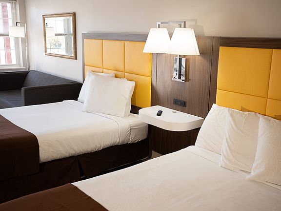 Spacious studio avaiable for rent in Ocean City. Steps away from the beach and the boardwalk. Room features two queen beds and a double sleep sofa, ensuring comfort for all. The kitchenette includes a 2-burner cooktop, full-sized fridge, microwave, coffee maker, and sink. Unwind in the full bathroom, complete with a shower and tub. Enjoy entertainment on the 55 flat-screen TV