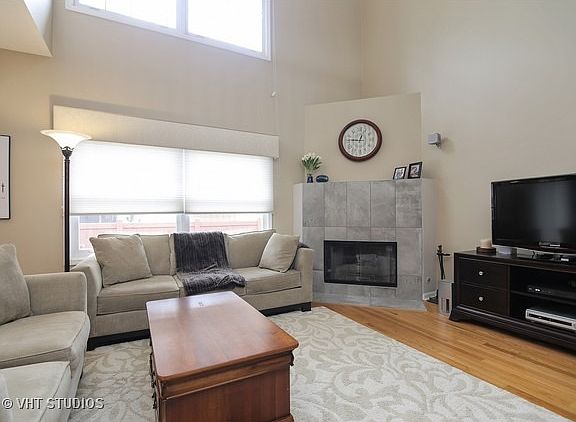 Spacious and rarely available townhouse in ideal, walk-to-everything location. Open floor plan with 18ft ceilings, fireplace, first floor laundry, and sliders out to deck. Kitchen finished with granite counter tops. Huge master bedroom has large walk-in closet, updated bath with shower and separate whirlpool tub. 2nd bedroom and full bath located on top floor with bonus, sunny loft area. Finished lower level offers over 400 square feet of additional living space plus incredible storage room and large closets. This well-maintained townhouse feels more like a single family home - so much space and tons of natural light! Metra, library, Heinen's Grocery Store, and many restaurants are just steps away!