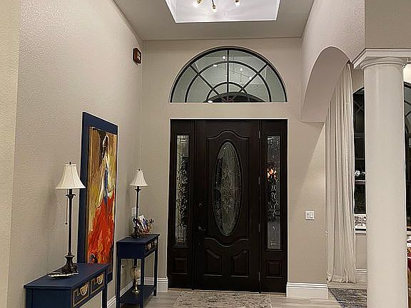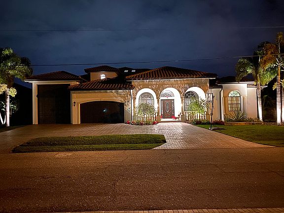 A waterfront dream home like this only comes around once in a great while! This custom built 5 bedroom plus den home has plenty of room for your family, boat, RV, and other toys too. The circular paver driveway and lush tropical landscaping provide plenty of curb appeal. Once inside, you are greeted by a large welcoming foyer and soaring cathedral ceilings. The formal dining room is a great place for large holiday meals while the breakfast nook makes the perfect place to enjoy more routine dining. The large open kitchen has a breakfast bar, granite counters, and custom wood cabinets. Under-cabinet lighting and plant shelves are nice details, too. Open to the kitchen is a large family room with sliders to the pool and patio. The large master bedroom suite is found on the first floor and features dual walk-in closets, dual sinks, garden tub, walk-in shower and custom vanities. A very large second bedroom is also on the first floor and could be utilized as an in-law suite. Upstairs you will find a large game room, 3 more guest bedrooms and a large guest bathroom with dual sinks. The interior laundry room has front-load washer/dryer, built-in clothes rack, utility sink, and a second fridge. An enormous 2 car plus RV garage with separate doors is the perfect place to store all of your toys or create a workshop. The RV side has 50 amp electric, sewer dump, and ceiling mounted winch. Dock has electric, water, and 10K lb. lift.