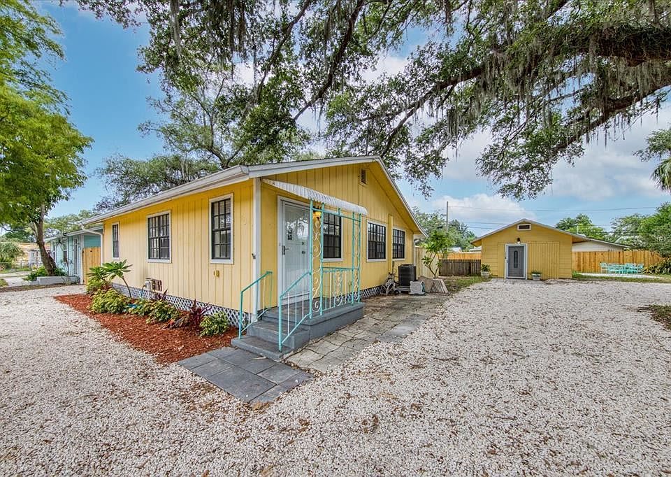 Just South of the Dunedin border is this house with detached cottage and detached garage on an oversized lot. Walk to Dunedin, or to the famous Edgewater Drive Park to view sunsets from the park benches. The house is just east of the Pinellas trail as well. The main house is 2 bed and 1 bath with a detached cottage that is set up as a self contained studio, and there is also a detached garage for a vehicle or storage. The property is perfect for investment and providing separate income streams. New decking was installed to enjoy your fenced in backyard for bbq's or cold beverages at sundown. The roof is 2019 and the circular driveway provides plenty of parking and easy entering and exiting the property. There is tons of potential on this lot and immediate value for the next owner!