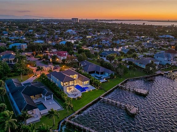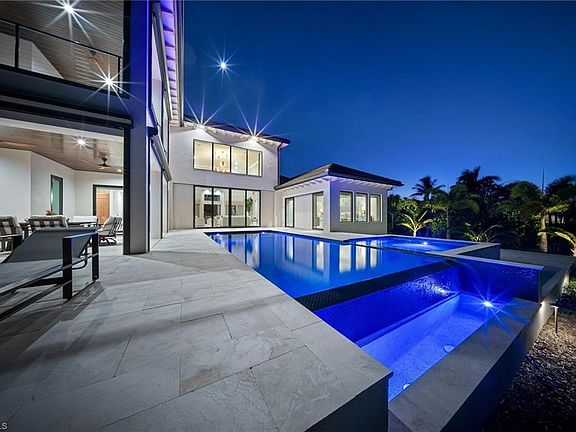 Experience the pinnacle of coastal luxury in this brand-new, turnkey furnished residence by renowned builder PGI Homes, perfectly situated within Trevi—an exclusive gated enclave of just seven custom waterfront estates. Showcasing a refined blend of modern design and timeless detail, this 4-bedroom + den residence invites you in with a grand 20-foot entryway, soaring ceilings, and a wall of glass framing the tranquil water views beyond. The open-concept great room flows seamlessly into a gourmet kitchen outfitted with custom crystal cabinetry, Wolf and Sub-Zero appliances, and an oversized waterfall island ideal for entertaining. The first-floor VIP suite offers a peaceful retreat with a spa-like bath and private flex space—perfect for a home office or nursery. Upstairs, an elegant staircase and elevator lead to a spacious loft and covered terrace overlooking the water, providing an additional setting for relaxation or recreation. Outdoors, enjoy an expansive lanai with a negative-edge pool and spa, summer kitchen with grill and roll-down screens, and a deep-water dock ready for your boat. Thoughtfully designed landscaping and a three-car garage complete the picture of effortless elegance. Set on an oversized cul-de-sac lot, this home defines the Southwest Florida lifestyle—light, bright, and beautifully livable from every angle.