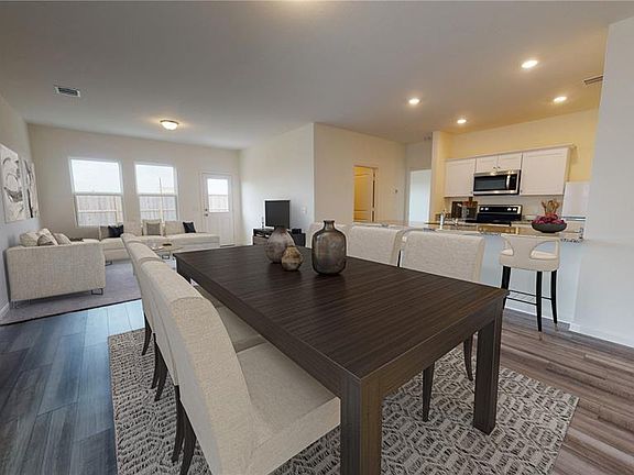 Large islandBreakfast barGranite countertopsOpen floor planStorage spacePlenty of natural lightDining area