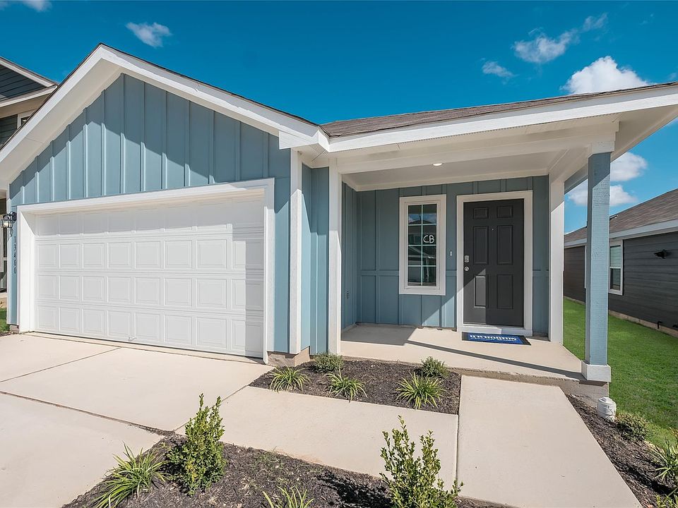 UNDER CONSTRUCTION - EST COMPLETION NOW!!!!!!!!!!!!!!!!!!!!! Photos are representative of plan and may vary as built. The Caroline is one of our one-story floorplans featured in our Durango community in Mustang Ridge, TX. This home offers 1,470 square feet of living space across 3 bedrooms and 2 bathrooms. As you enter into the long foyer you walk into the spacious kitchen overlooking the dining area and living room. The kitchen features stainless steel appliances, large pantry and a kitchen island. You will find the two extra bedrooms and full secondary bathroom are located off the kitchen. The private main bedroom is located off the living room providing privacy. The main bedroom includes an ensuite with a huge walk-in closet and walk-in shower. This home comes included with a professionally designed landscape package and a full irrigation system as well as our Home is Connected base package that offers devices such as a Video Doorbell, Deako Smart Light Switch, a Honeywell Thermostat, and more.