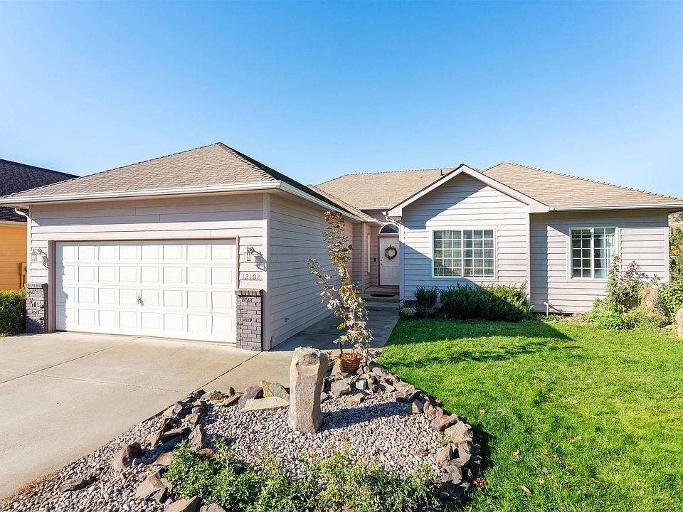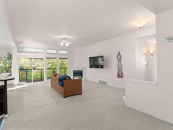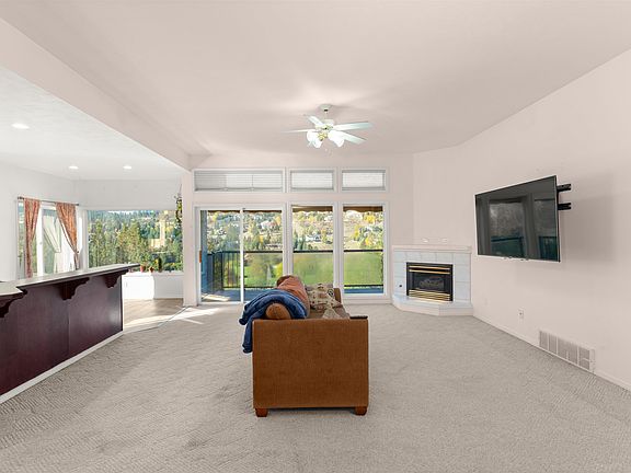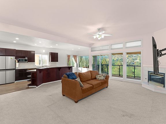 Perched above Latah Creek with stunning views of golf course holes 10-14, this exceptional daylight rancher offers both space and versatility. Featuring five bedrooms, three bathrooms, two kitchens, and two fireplaces, it's an ideal home for a growing household or multi-generational living. Designed for entertaining, the open floor plan maximizes natural light and scenic views from every angle. Enjoy step-free access through the attached two-car garage, leading to the main-floor mudroom and laundry. The primary suite is a true retreat, complete with a walk-in closet, dual sinks, a garden tub, and private access to the upper balcony—perfect for taking in the endless views. Two additional bedrooms and another full bath complete the main level. Downstairs, you'll find a second full kitchen, two more bedrooms, a spacious family room with a pass-through fireplace, and another private balcony. With HOA-covered yard maintenance, you can spend more time on the golf course—just hop in your cart