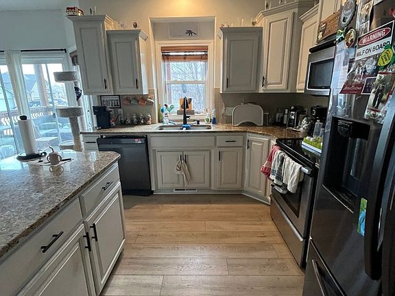 Spacious covered front porchOpen floor planKitchen islandBasement features family roomSolid surface countersUpdated light fixturesTons of cabinets