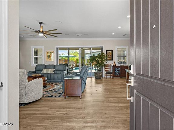 Experience resort-style living in this highly sought-after Bayberry model in Regency at Caramella Ranch, a 55+ community offering exceptional amenities. Set on a private cul-de-sac, this 2,660 sq ft home showcases over 300,000 in owner and builder upgrades and features 2 bedrooms plus office and 2.5 bathrooms. Designed with comfort and flexibility in mind, the open-concept great room includes family, dining, and bonus spaces anchored by a dramatic stacked-stone fireplace, built-in cabinetry, and surround sound. A chef's kitchen with Wolf appliances, Sub-Zero refrigerator, wine fridge, and expanded granite island creates the perfect setting for entertaining. Step outside to your own backyard retreat. An expansive covered paver patio with built-in BBQ and outdoor speakers overlooks the showpiece: a heated in-ground pool/spa (spool) with waterfalls, firepit, and jets for ultimate relaxation. Surrounded by lush landscaping accented with pine and aspen trees, the setting is private and serene—ideal for gatherings or just unwinding in your tranquil sanctuary while enjoying fabulous views of the eastern Virginia Range. Additional features include retractable screens, plantation shutters, wood-look tile flooring, epoxy-finished garages, and a fully insulated backyard shed with power and storage. This home combines luxury upgrades with an unparalleled outdoor living experience in one of Reno's premier active-adult communities.