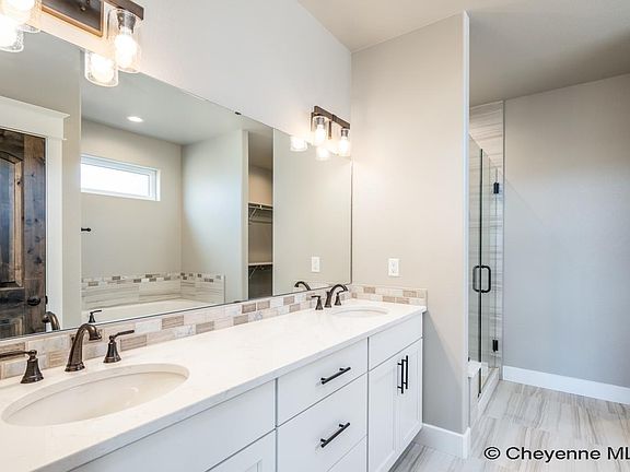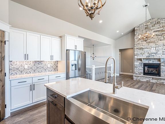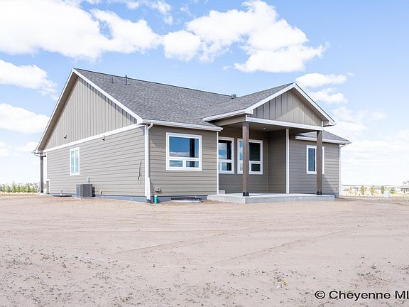 Stunning Woods Brothers home in Bell Pasture with exquisite attention to detail throughout. Abundance of natural light with 8 foot by 12 foot sliding glass doors to the back deck on the main level. Walkout basement feels light and bright with the second 8x12 foot sliding glass door. gourmet kitchen with 48' range and hood vent, Open great room with vaulted ceilings, hardwood floors, a large deck with views of Rockies Mountain. Unique custom finishes throughout this Woods Brothers Construction home include a gourmet kitchen with 48” gas range with double ovens, and vented hood. Primary suite with five-piece master bath with freestanding bathtub. Large 46x12 deck with the most amazing views, gas log fireplace and 46x12 covered patio at walkout. Upgrades include 50 year shingles, air conditioning, fully finished 4 car garage that is insulated and drywalled with texture and painted, 8 foot solid doors, FINISHED walkout basement with wet bar, vault in basement, covered front patio and composite covered desk in the back, insulated garage door with R -value of 13 and WIFI compatible garage door openers. All this and in Lovely Bell Pastures, just North of Cheyenne and right off of I-25 with paved road and fiber high speed internet! These photos are form a previous home with the same floor plan. The photos do not show or reflect the two 8x12 sliding glass doors or the walkout basement.