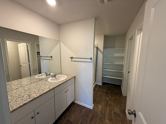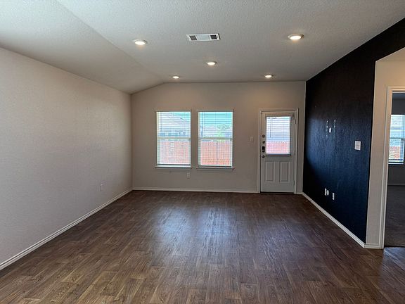 Ready for MOVE-IN! This charming one-story home in the popular Stoney Creek subdivision offers a modern, open layout with wood-look vinyl flooring throughout the living and kitchen areas. The kitchen features crisp white cabinets, a center island, and black appliances, including a refrigerator. The spacious living room is filled with recessed lighting, creating a bright and welcoming space. The master suite boasts high ceilings, recessed lighting, a single vanity, a large walk-in shower, and an oversized walk-in closet. Step outside to a covered patio with privacy fencingperfect for relaxing or entertaining. Conveniently located near Lackland Air Force Base, major highways, shopping, and dining.