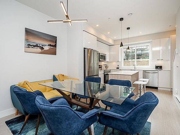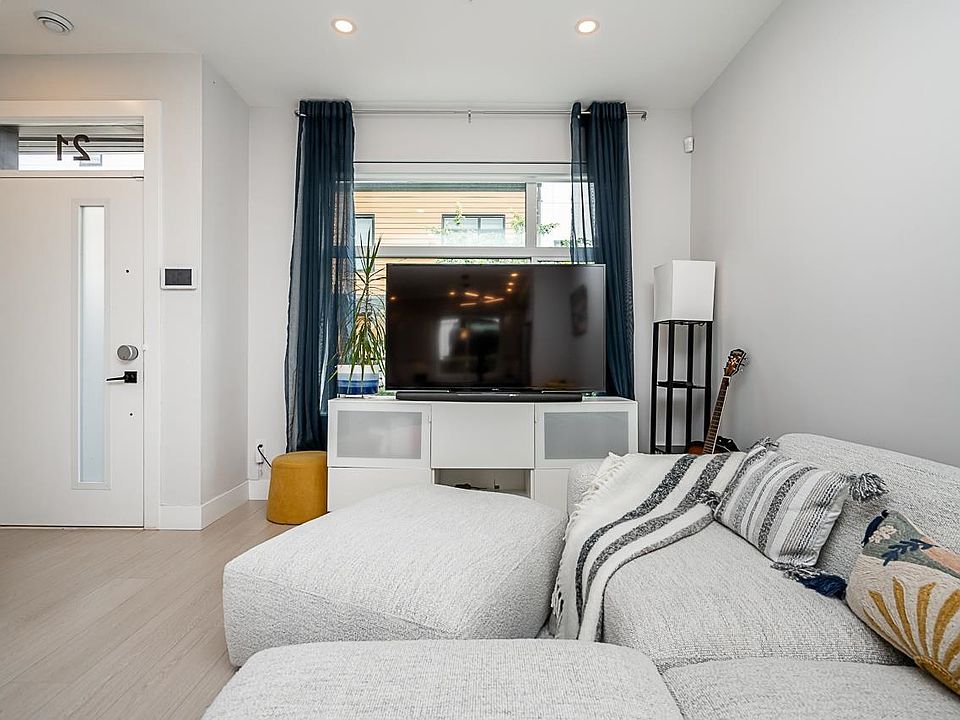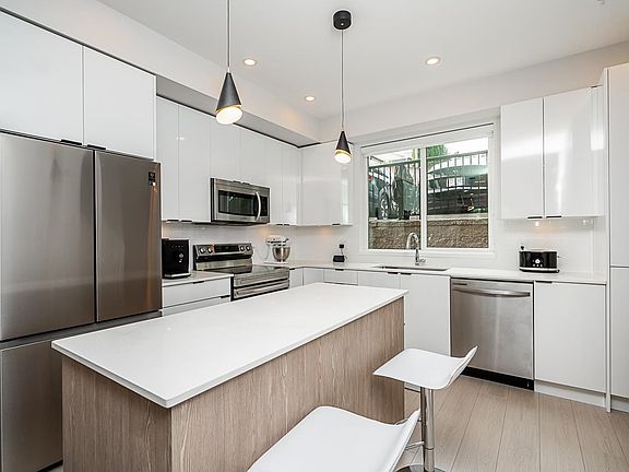 ELINA ON EIGHTH – Built in 2021, this QUIET THREE-bedroom townhome offers spacious rooms, a bathroom on every floor, a private patio & top-floor deck with city & water VIEWS. Smart features include intelligent thermostats, ambient lighting with dimmers, video doorbell & EV charger. Owners added thoughtful upgrades: blackout blinds, custom closets with integrated lighting, extra bathroom cabinetry. Enjoy 9ft ceilings on the main & soaring 11ft in the primary. There is a 4-ft crawl space with plenty of storage, a rare bonus in townhome living. Family and pet-friendly living steps to Moody Park, shops, transit. Easy (no bridge) access to Burnaby & Vancouver. Steps to Lord Tweedsmuir Elementary, near New Westminster Secondary, John Knox Christian & Urban Academy. OPEN HOUSE OCT 4, 2–4 PM.