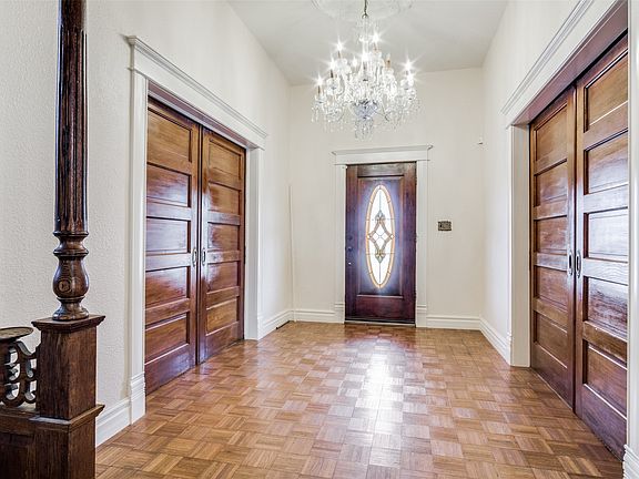Charm Abounds in this Downtown Weatherford Beauty with 36' Wrap Around Porch and *SPARKLING POOL* The Circle Drive, 4 Car Gated Carport and Grand Elevation welcome you into the Parquet Wood Floor Entry with Classic Corbels & Pocket Doors. The flex layout allows the formal dining to also serve as a formal study. The large living with Ornamental Fireplace is perfect for entertaining. The kitchen has Walnut cabinets, tile countertops, a built in microwave, Electric stovetop and a Fridge that stays. The original hardwood staircase leads to all beds up with original wood flooring throughout. The primary bed has dual cedar closets and a fireplace with antique mantle. Don't miss the ornate balcony overlooking the frontscape. Secondary beds are spacious with large closets. The full baths up and down have shower tub combos and generous vanities. Outside enjoy a grand pool with water feature, spa, 8x8 pergola storage building and an old well house. 2025 New Roof. 2025 New Siding West & South.