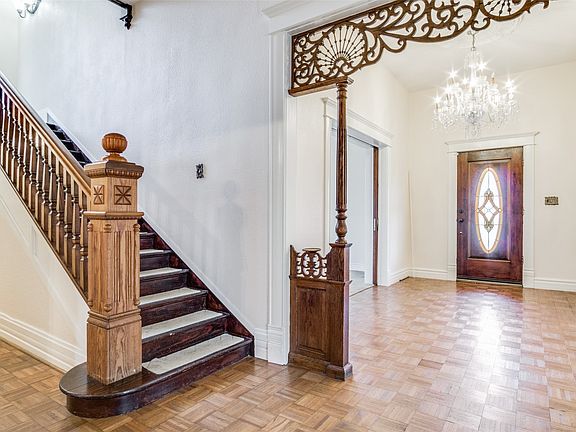Sparkling poolOrnamental fireplaceOrnate balconyParquet wood floor entryOriginal hardwood staircaseOriginal wood flooringStorage building