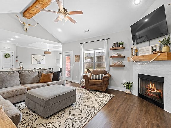 Come over to this well maintained open floor plan! This home has so many extras like a coffee bar, pantry, large walk in closet, overhead storage in the garage, backyard storage shed and vaulted ceilings. The living room features a gas fireplace with wiring above for a convenience. Spacious kitchen features granite counters, built-in microwave and oven, glass cooktop, pantry, island with space for barstools, and an eat-in dining area. Wood-look LVP flooring throughout common areas and bathrooms. Split bedroom floor-plan. The master suite features a walk-in closet, large shower, and two vanities in the bathroom. Large 2 car garage. Covered back patio wired for TV. The lot is level with full backyard privacy fencing--a great spot for a playset or just relaxing in the backyard!