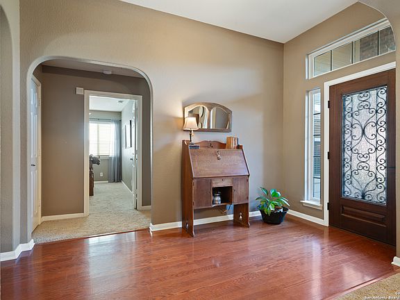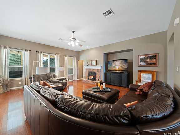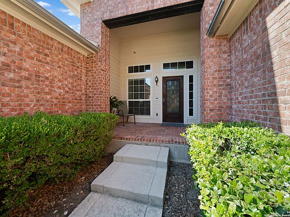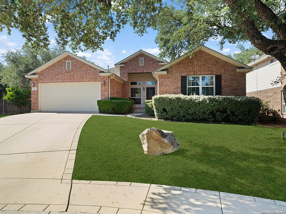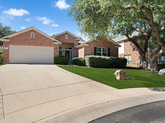 Welcome Home to this spacious, single-story home nestled in the highly sought-after Links of Canyon Springs community. Designed for both relaxation and entertaining, the backyard oasis features a sparkling Keith Zars pool, an expansive covered patio, and ample space for play or gatherings. Inside, you'll find impressive high ceilings and an open-concept layout that seamlessly connects the living spaces. The large family room, complete with a cozy gas fireplace, flows effortlessly into the chef-inspired island kitchen, which boasts a gas range, breakfast bar, walk-in pantry, and abundant storage-all with views of the backyard retreat. Additional highlights include a formal dining room, generously sized secondary bedrooms with walk-in closets, and a private primary suite offering a spa-like bath for the perfect escape. Enjoy the convenience of top-rated NEISD schools and quick access to Hwy 281, shopping, dining, and more. This home truly has it all-style, comfort, and location.